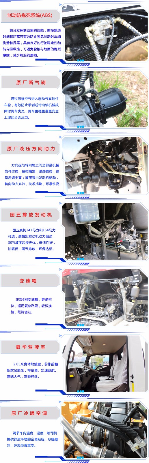 底盘配置:该车才用福田康明斯154马力发动机(欧五排放标准带尿素罐),6档手动变速箱,3800mm轴距,7.50R16钢丝胎,气刹,带冷热空调,带离合器助力,带方向助力,带定速巡航功能,2.05米宽体驾驶室。总质量:7吨,车身自重4.8吨。